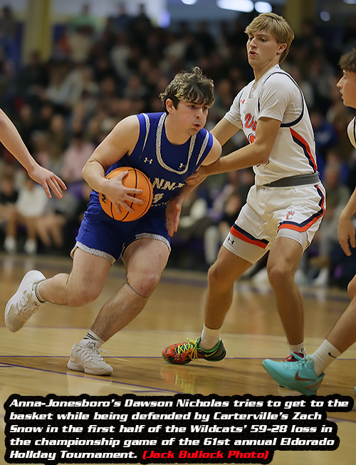 The all-tournament team of the 61st annual Eldorado Holiday Tournament was led by tournament MVP Colton Hawkins of Carterville. Teammate Max Gulley was also named to the squad along with Dawson Nicholas and Kaleb Gore of Anna-Jonesboro, Jaxon Faulkenberry and JJ Gwaltney of Herrin, Silas Kreuter of Vienna, Landon Fricker of Hardin County, Cash Conner of Edwards County and Owen Gruen and Jake Easton of Fairfield.