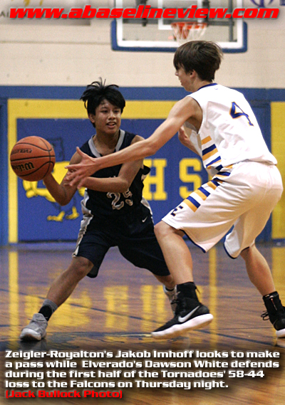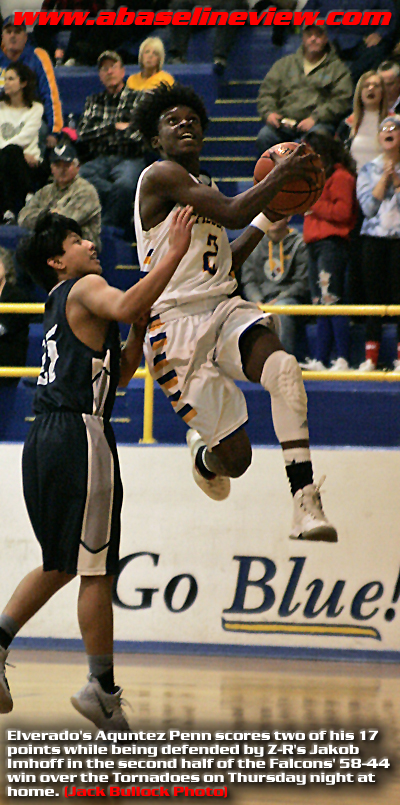But two baskets by Elverado's Trey Bernardini and Penn, both on fast breaks, followed by a bucket from Z-R's senior Noah Leeper, ended the half at 30-22 Falcons.